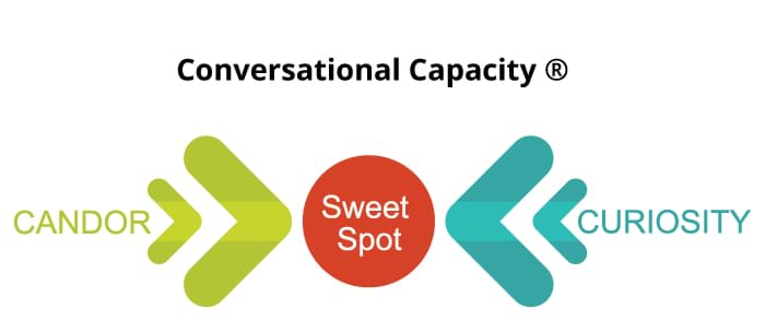 Conversational Capacity is the ability of an individual or a team to engage in open, balanced, nondefensive dialogue about difficult subjects and in challenging circumstances. It provides the tools to keep your conversations in the “sweet spot”—where learning, collaboration, and innovation are at their highest.